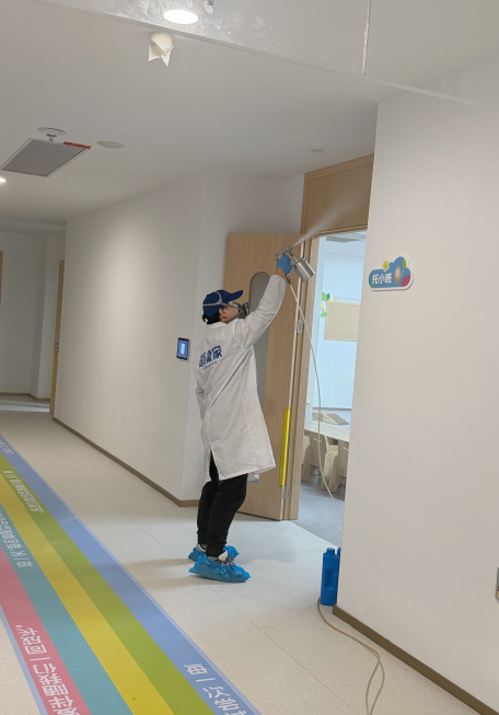 本次服務(wù)的托育園總面積 1400㎡,涵蓋多個(gè)教學(xué)活動(dòng)室、幼兒睡眠區(qū)、公共游戲區(qū)及配套功能室,裝修后存在課桌椅、儲(chǔ)物柜、軟包教具、PVC 地墊、墻面涂料等多重甲醛釋放源,且因空間布局分散、兒童接觸場(chǎng)景多,對(duì)治理藥劑的安全性、施工的精細(xì)化要求遠(yuǎn)高于普通場(chǎng)所。我們的團(tuán)隊(duì)以《托育機(jī)構(gòu)衛(wèi)生評(píng)價(jià)基本標(biāo)準(zhǔn)》《室內(nèi)空氣質(zhì)量標(biāo)準(zhǔn)》為核心依據(jù),參照比國標(biāo)嚴(yán)苛 20% 的母嬰級(jí)治理要求,量身制定「精準(zhǔn)勘測(cè) - 分域治理 - 源頭分解 - 長效防護(hù)」的全流程除醛方案,全程遵循安全無刺激、施工無死角、效果可驗(yàn)證的三大原則,確保治理后可快速投入使用。