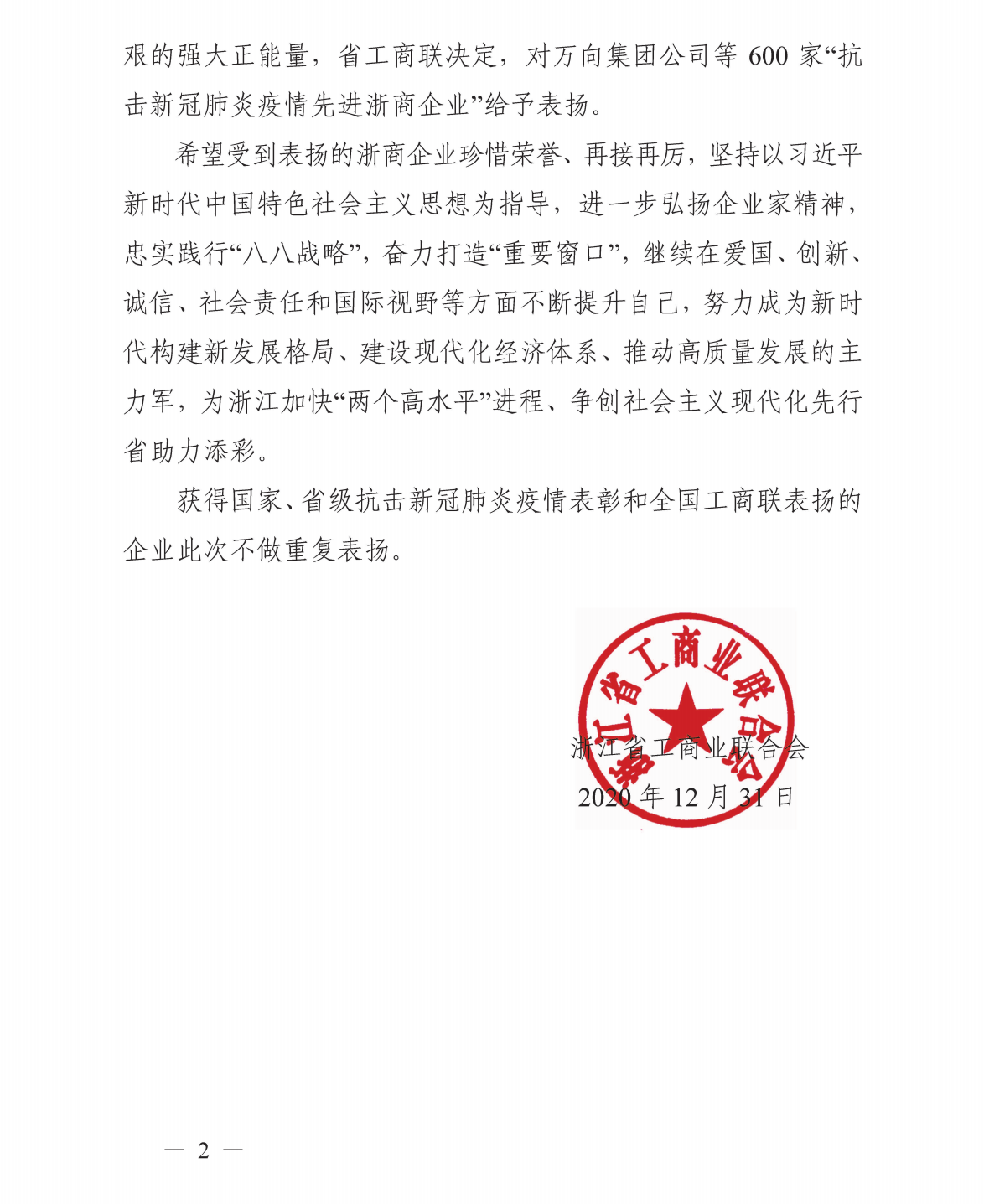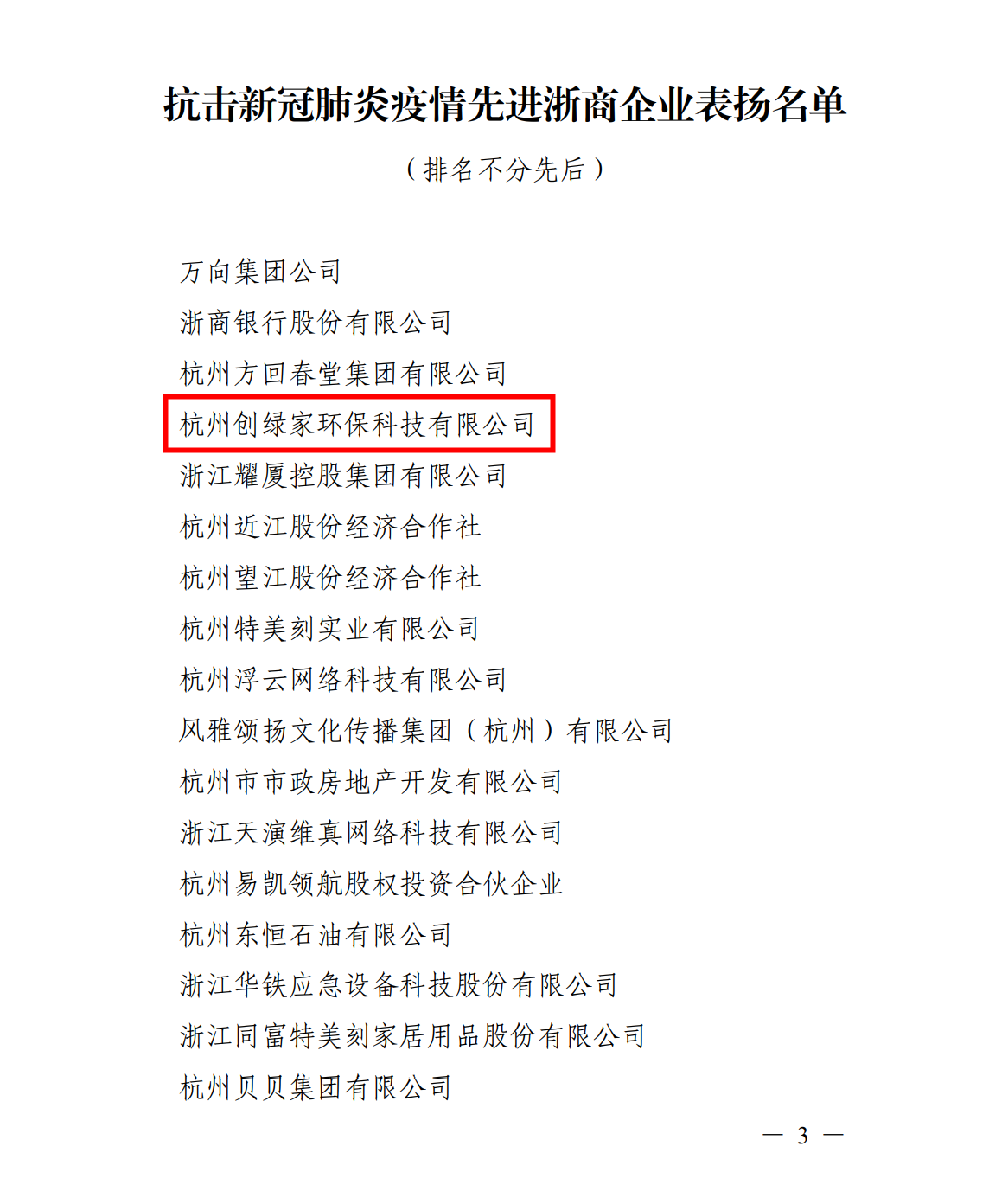 為大力弘揚(yáng)在抗擊新冠肺炎疫情中形成的偉大精神,充分激發(fā)廣大浙商的責(zé)任感和使命感,近日,浙江省工商業(yè)聯(lián)合會(huì)發(fā)布了關(guān)于對(duì)抗擊新冠肺炎疫情做出優(yōu)異成績(jī)的先進(jìn)浙商企業(yè)予以表?yè)P(yáng)的通報(bào),杭州創(chuàng)綠家環(huán)??萍加邢薰颈辉u(píng)為“抗擊新冠肺炎疫情先進(jìn)浙商企業(yè)”。