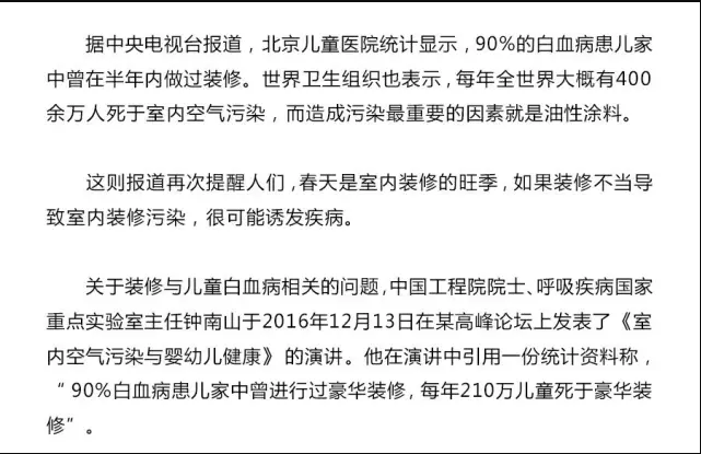 由此看來,媒體報道的90%的兒童白血病患者與家庭裝修有關至少有一些限定因素,例如,僅限于城市兒童,僅限于一些城市。
